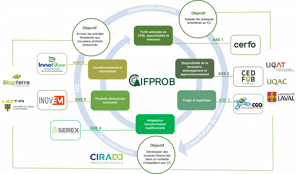 Le CIFPROB-FRQ implique 13 chercheurs de 8 CCTT (Biopterre, CERFO, CEDFOB, CGQ, Innofibre, Inovem, Serex, CIRADD) et 4 professeurs d’université (UQAT, UQTR, UQAC, ULaval), tous experts dans le domaine de la foresterie, de l’aménagement, de la sylviculture, de la transformation du bois, des produits biosourcés, de l’innovation sociale et du développement durable. Il compte également des partenaires du milieu ayant des rôles importants dans l’écosystème de la bioéconomie forestière du Québec et les communautés régionales: le Consortium de recherche et innovation en bioprocédés industriels au Québec (CRIBIQ) qui compte plus de 230 membres, Signature Bois Laurentides (SBL) avec plus de 50 membres, la Société de développement économique Ilnu de Mashteuhiatsh (SDEI), Mi’gmawei Mawiomi Business Corporation de Gesgapegiag (MMBC), Innovation et développement économique Trois-Rivières (IDETR) et Les jardins forestiers de l’ours alpha (JFOA).